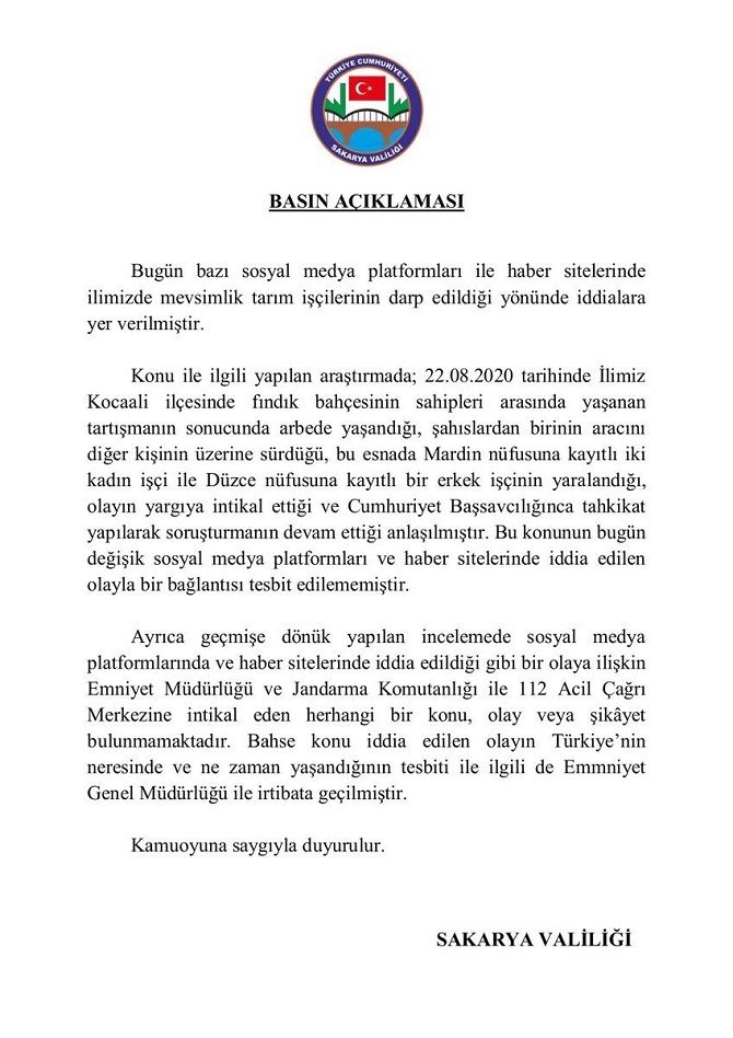 Sakarya Valiliginden Mevsimlik Tarim Iscilerine Darp Iddialariyla Ilgili Aciklama