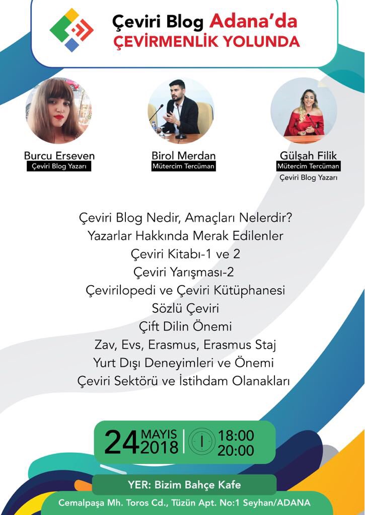 Ceviriblog A Twitter Cevirmenlik Yolunda Adana Yazar Ekibimizden Gulsah Filik Ve Burcu Erseven Ile Mutercim Tercuman Birol Merdan Genc Cevirmenlere Destek Vermek Icin Kollari Sivadi 24 Mayis 2018 18 00 20 00 Yer Bizim